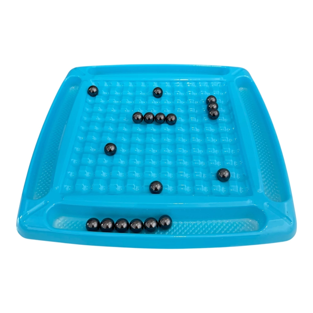 Duelo para dos: Los jugadores dividen un número igual de esferas magnéticas y las colocan por turnos en el tablero cuadriculado. El desafío es evitar la atracción magnética con las piezas ya colocadas. Quien haga que las piezas se unan pierde la ronda.