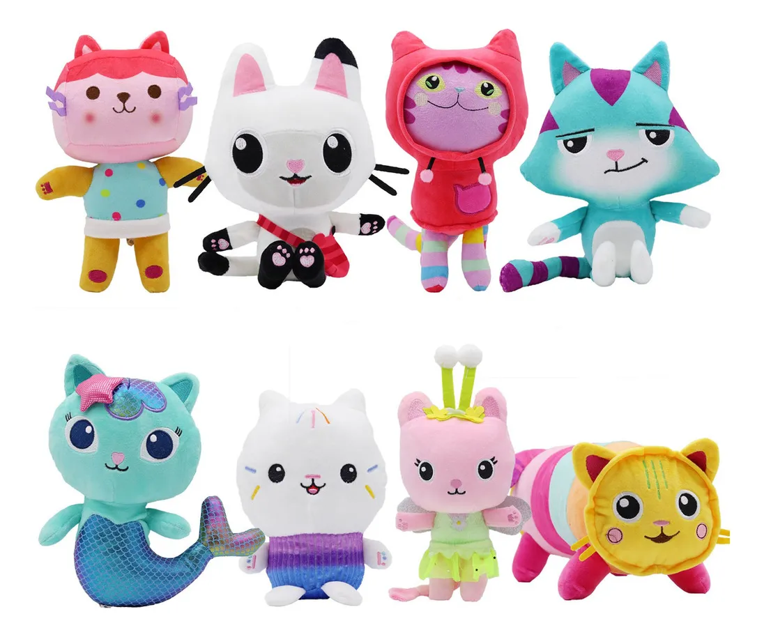 Peluches de la serie animada Gabby’s Dollhouse (La Casa de las Muñecas de Gabby), con diseños coloridos y suaves al tacto.