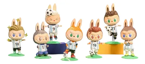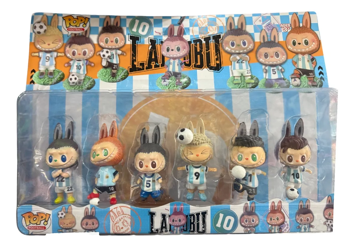 Set de 6 figuras Labubu edición fútbol, representando a jugadores con la camiseta de la selección Argentina.