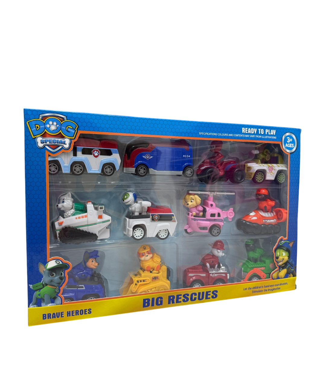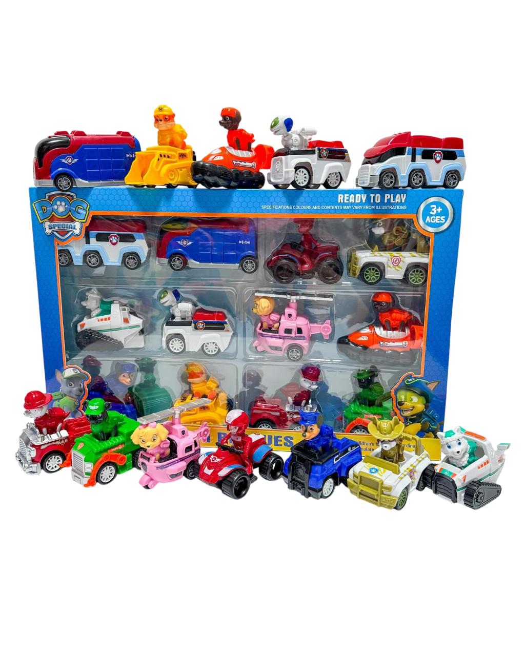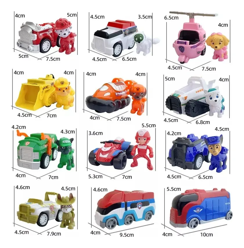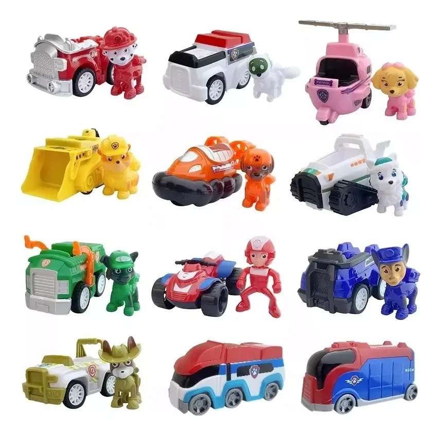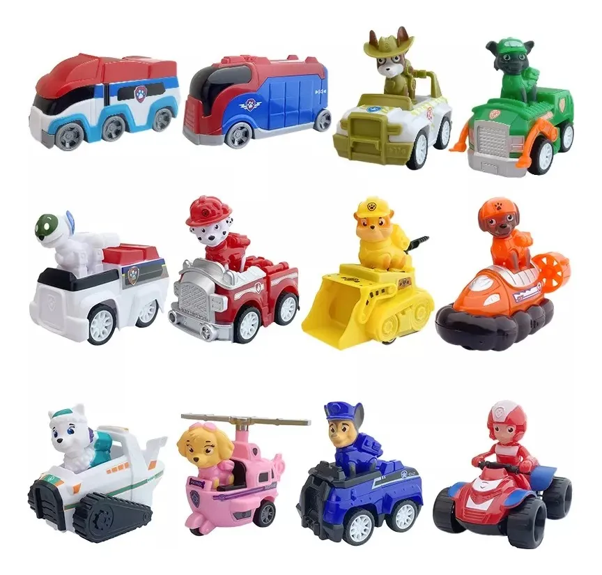 Set completo de 12 vehículos con perritos inspirado en los personajes favoritos de Paw Patrol. Cada figura viene con su propio vehículo temático, ideales para jugar y recrear aventuras de rescate.
